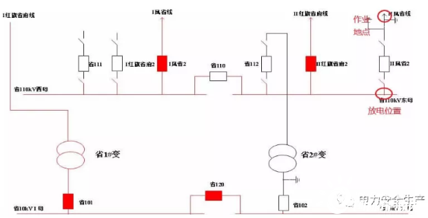 事發(fā)項目為某公司110千伏某變電站110千伏配電裝置改造,改造內(nèi)容為更換110千伏室內(nèi)敞開式手車斷路器,施工中標單位為某集團有限公司電力安裝分公司(省管產(chǎn)業(yè)單位,簡稱“安裝分公司”)。為不影響重要用戶供電,改造期間變電站采用Ⅰ紅旗省府線直接串帶省1#變、Ⅱ鳳省線直接串帶省2#變的過渡方式運行。6月12日改造完成后,110千伏母線恢復(fù)運行。(運行方式見圖1、圖2)