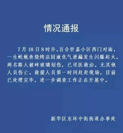 兩名路人被碎玻璃劃傷,已送醫(yī)救治,無其他人員傷亡。救援人員第一時(shí)間趕赴現(xiàn)場(chǎng),目前明火已撲滅,進(jìn)一步調(diào)查正在開展中。