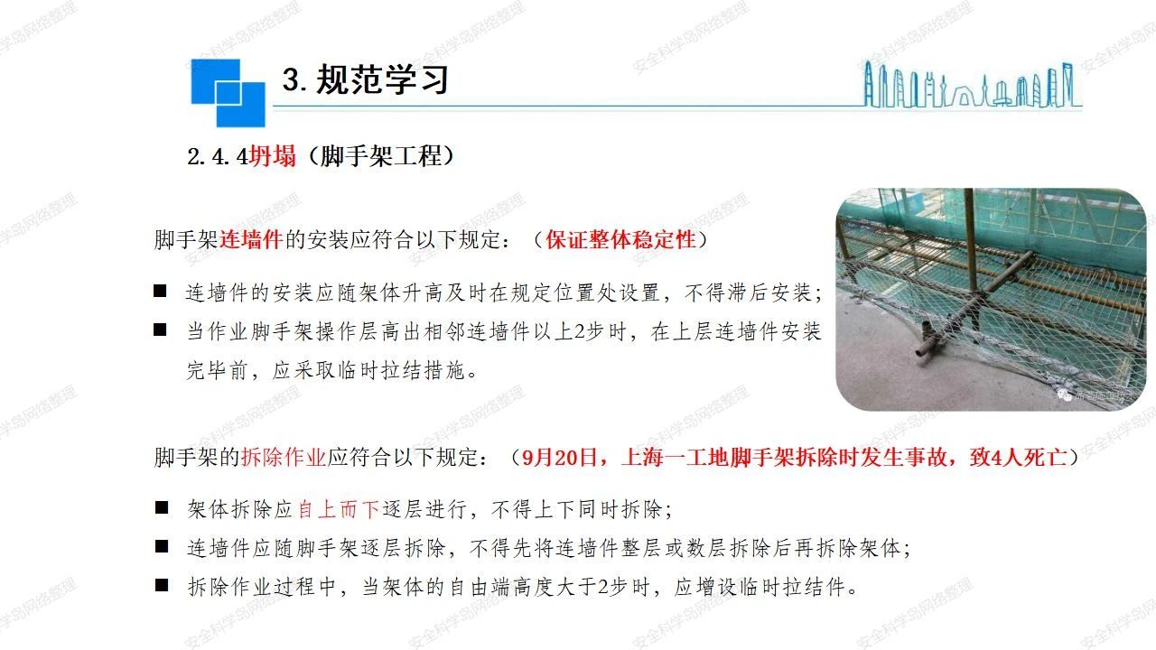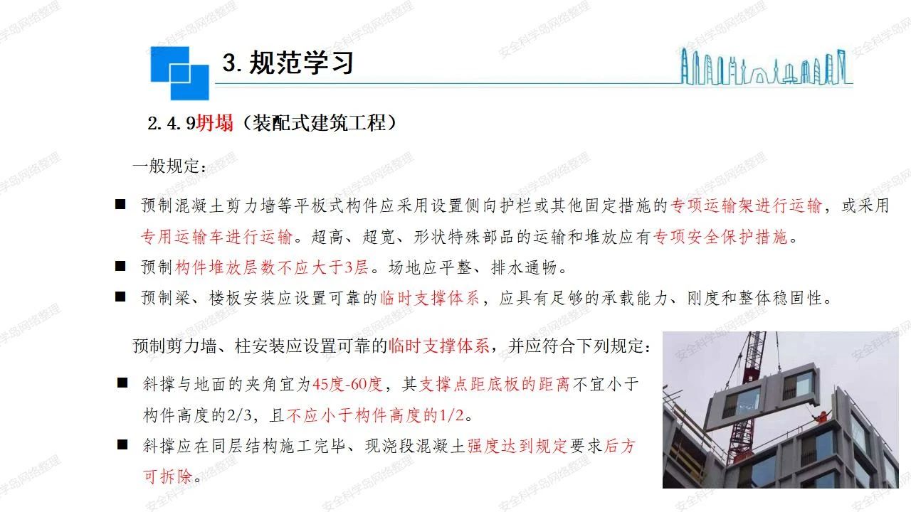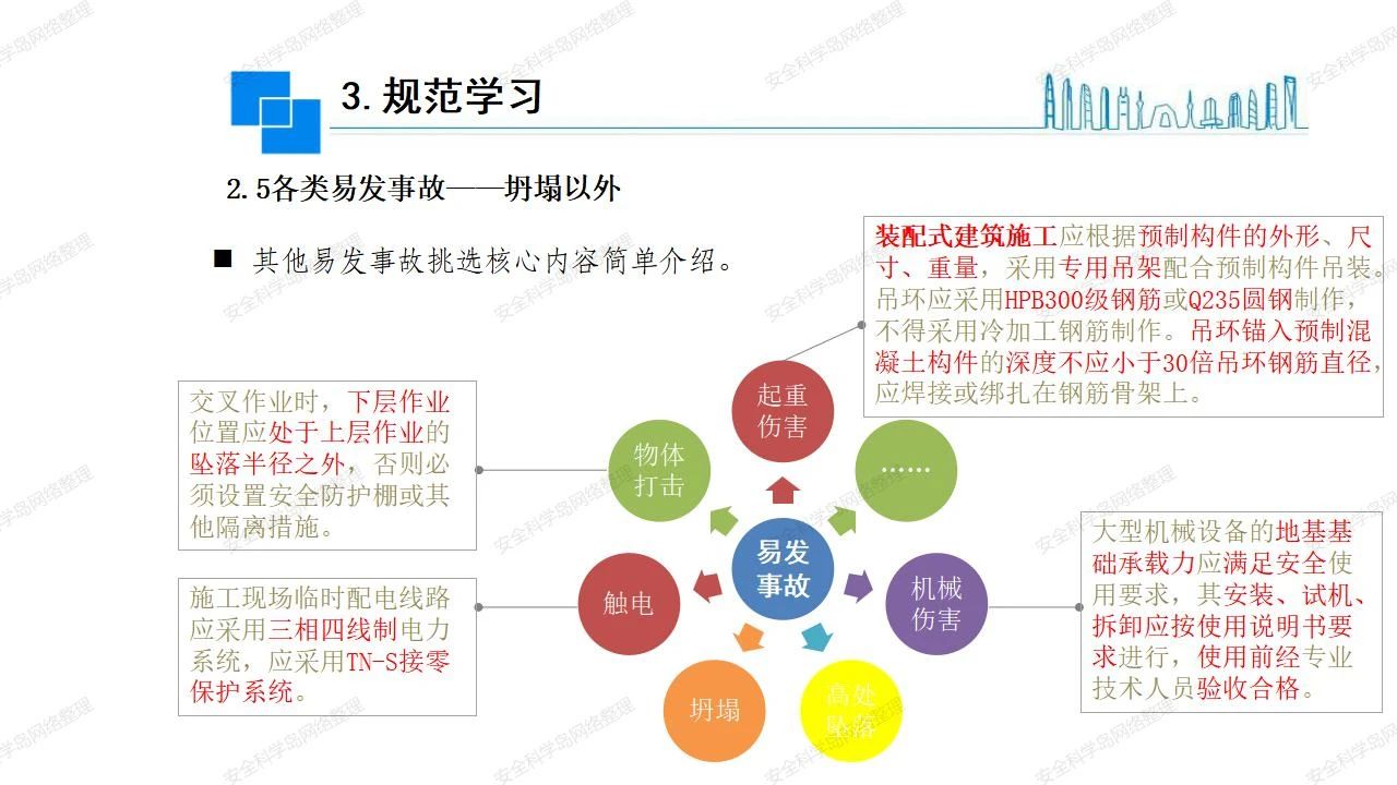 那么,坍塌事故發(fā)生的原因何在? (1)工程結構設計不合理或計算失誤。 (2)施工前沒有編制切實可行的施工組織設計和專項施工方案,未做具體技術安全措施交底,特定施工項目未經(jīng)專家評審論證。 (3)腳手架、模板支撐、起重設備結構設計不合理或計算失誤。 (4)建筑物結構質量低劣,安全性能差,地基不穩(wěn)定,不均勻沉降。 (5)建筑物結構支撐連接(焊接)不牢固,超載、外力沖擊或嚴重偏心載荷造成失穩(wěn)等。 (6)腳手架及高大模板支架架體結構不符合設計與規(guī)范要求,整體安全穩(wěn)定性差、超載或嚴重偏心荷載,遇外力沖擊或振動,不按程序拆除架體等因素造成失穩(wěn)等。 (7)基坑、土石方挖土時土壁不按規(guī)定留設邊坡(甚至負坡度),缺乏支護或支護不良,土質不良或出現(xiàn)地下水、地表水的滲透,土壁經(jīng)不起重載側壓力或遇外力振動、沖擊等因素造成土壁失穩(wěn)滑坡坍塌。 (8)起重設備技術安全性能差,結構強度不夠,安全防護裝置不完善,垂直起重機與建筑物拉結差,出現(xiàn)超載、碰撞、升降過度或違章操作等原因,造成起重設備倒塌。 (9)現(xiàn)場作業(yè)環(huán)境不良,安全防護設施缺乏。 (10)施工現(xiàn)場管理松弛,各項質量、安全管理制度流于形式。 (11)片面追求經(jīng)濟利益,偷工減料,施工質量差。 (12)施工隊伍素質差,不執(zhí)行法規(guī)、標準,違章指揮、違章作業(yè),思想上存在盲目性、冒險性、隨意性。 如何預防坍塌事故? (1)根據(jù)設計與規(guī)范要求,認真編制施工組織設計和專項施工技術方案、應急預案,做好特定施工項目專家評審論證及技術安全交底工作。 (2)支架、腳手架等搭設完成后應組織相關部門驗收。支架還應按方案要求進行堆載預壓。 (3)嚴格控制模板支架、腳手架等承受的荷載,模板、腳手架及其支撐體系的施工荷載應做到均勻分布,并不得超過設計要求。嚴禁超載、對構筑物進行外力沖擊或偏心載荷。 (4)基坑、土石方挖土時土壁按規(guī)定留設邊坡,嚴格按照設計坡度進行放坡開挖,進行有效支護和排水,并設置專人對邊坡穩(wěn)定性進行檢測。基坑應基坑頂邊緣1m范圍內(nèi)禁止堆放材料。 (5)加強起重設備的采購管理,嚴禁使用不合格的起重設備,并定期進行檢測,確保各項性能和安全防護裝置良好;加強起重設備的安裝、拆除管理;加強起重設備的使用管理,嚴禁超載、碰撞或違章操作;加強對起重設備操作人員、指揮人員、安拆人員的安全教育培訓,考核合格后持證上崗。 (6)加強施工現(xiàn)場管理,設置有效安全防護設施。 (7)加強對從業(yè)人員的培訓教育,提高隊伍素質,強化質量、安全意識。 (8)強化工程質量報驗和檢驗、簽證制度,不經(jīng)檢驗合格,不準進行下道工序施工。 (9)發(fā)現(xiàn)坍塌事故的險情,要認真分析原因,積極研究提出排除隱患的整改措施,并監(jiān)督執(zhí)行。