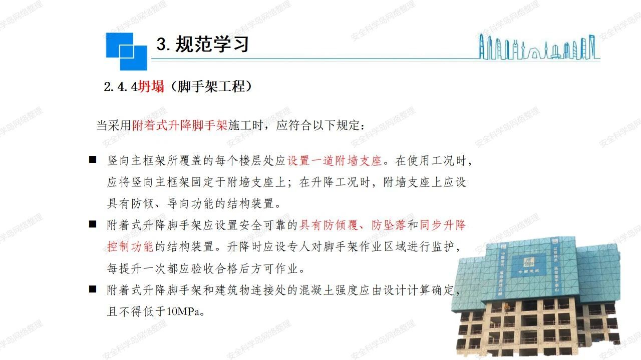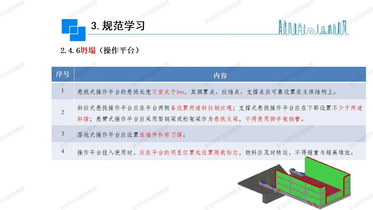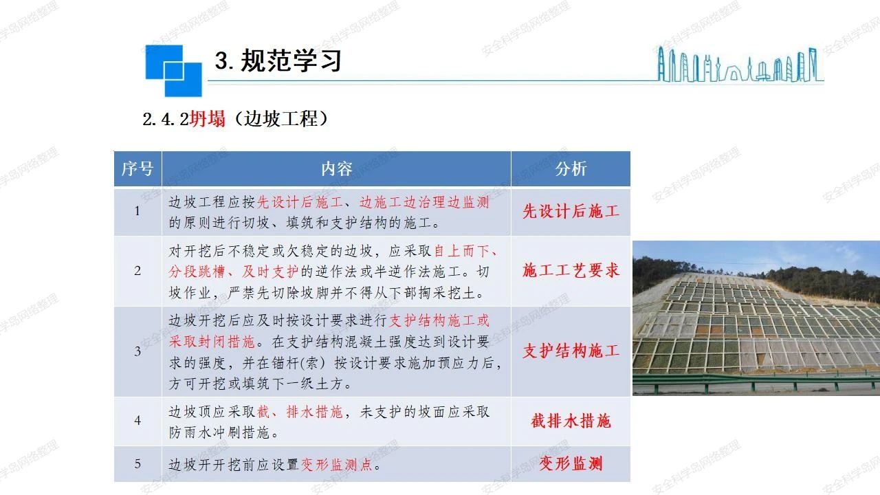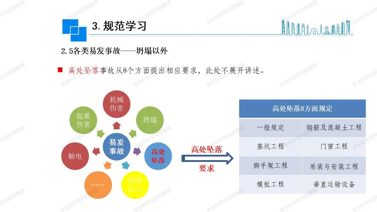 那么,坍塌事故發(fā)生的原因何在? (1)工程結構設計不合理或計算失誤。 (2)施工前沒有編制切實可行的施工組織設計和專項施工方案,未做具體技術安全措施交底,特定施工項目未經(jīng)專家評審論證。 (3)腳手架、模板支撐、起重設備結構設計不合理或計算失誤。 (4)建筑物結構質量低劣,安全性能差,地基不穩(wěn)定,不均勻沉降。 (5)建筑物結構支撐連接(焊接)不牢固,超載、外力沖擊或嚴重偏心載荷造成失穩(wěn)等。 (6)腳手架及高大模板支架架體結構不符合設計與規(guī)范要求,整體安全穩(wěn)定性差、超載或嚴重偏心荷載,遇外力沖擊或振動,不按程序拆除架體等因素造成失穩(wěn)等。 (7)基坑、土石方挖土時土壁不按規(guī)定留設邊坡(甚至負坡度),缺乏支護或支護不良,土質不良或出現(xiàn)地下水、地表水的滲透,土壁經(jīng)不起重載側壓力或遇外力振動、沖擊等因素造成土壁失穩(wěn)滑坡坍塌。 (8)起重設備技術安全性能差,結構強度不夠,安全防護裝置不完善,垂直起重機與建筑物拉結差,出現(xiàn)超載、碰撞、升降過度或違章操作等原因,造成起重設備倒塌。 (9)現(xiàn)場作業(yè)環(huán)境不良,安全防護設施缺乏。 (10)施工現(xiàn)場管理松弛,各項質量、安全管理制度流于形式。 (11)片面追求經(jīng)濟利益,偷工減料,施工質量差。 (12)施工隊伍素質差,不執(zhí)行法規(guī)、標準,違章指揮、違章作業(yè),思想上存在盲目性、冒險性、隨意性。 如何預防坍塌事故? (1)根據(jù)設計與規(guī)范要求,認真編制施工組織設計和專項施工技術方案、應急預案,做好特定施工項目專家評審論證及技術安全交底工作。 (2)支架、腳手架等搭設完成后應組織相關部門驗收。支架還應按方案要求進行堆載預壓。 (3)嚴格控制模板支架、腳手架等承受的荷載,模板、腳手架及其支撐體系的施工荷載應做到均勻分布,并不得超過設計要求。嚴禁超載、對構筑物進行外力沖擊或偏心載荷。 (4)基坑、土石方挖土時土壁按規(guī)定留設邊坡,嚴格按照設計坡度進行放坡開挖,進行有效支護和排水,并設置專人對邊坡穩(wěn)定性進行檢測。基坑應基坑頂邊緣1m范圍內(nèi)禁止堆放材料。 (5)加強起重設備的采購管理,嚴禁使用不合格的起重設備,并定期進行檢測,確保各項性能和安全防護裝置良好;加強起重設備的安裝、拆除管理;加強起重設備的使用管理,嚴禁超載、碰撞或違章操作;加強對起重設備操作人員、指揮人員、安拆人員的安全教育培訓,考核合格后持證上崗。 (6)加強施工現(xiàn)場管理,設置有效安全防護設施。 (7)加強對從業(yè)人員的培訓教育,提高隊伍素質,強化質量、安全意識。 (8)強化工程質量報驗和檢驗、簽證制度,不經(jīng)檢驗合格,不準進行下道工序施工。 (9)發(fā)現(xiàn)坍塌事故的險情,要認真分析原因,積極研究提出排除隱患的整改措施,并監(jiān)督執(zhí)行。