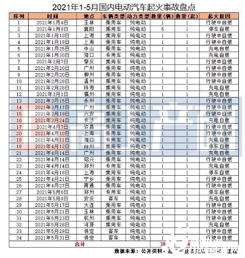 根據(jù)公告資料不完全統(tǒng)計,2021年1-5月國內(nèi)共發(fā)生電動汽車起火事故34起,較去年同期增加20起;涉及車輛數(shù)目38輛,較去年同期增長73%,隨著國內(nèi)電動汽車保有量的快速增長,起火事故備受業(yè)內(nèi)關注。
